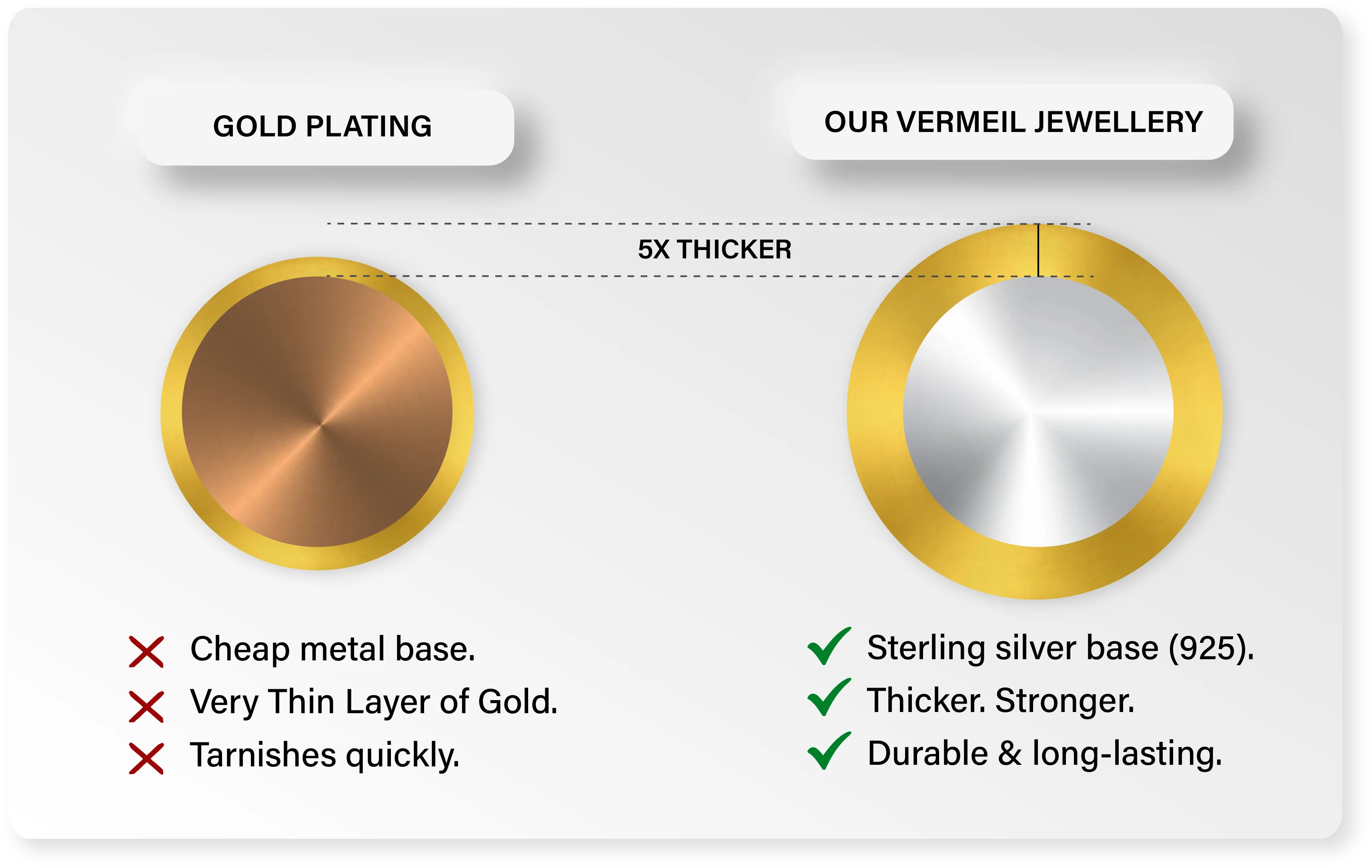 18K Gold Vermeil (ver-may) is more than just plating—it's a thick, lustrous layer of 18K gold over sterling silver, delivering both luxury and lasting brilliance. This premium craftsmanship ensures long-lasting wear, making it perfect for fine jewellery. Enjoy the rich glow of gold with the added benefit of being more affordable than solid gold, giving you the glam vibe without the high price. It's timeless, elegant, and designed to elevate your everyday style.