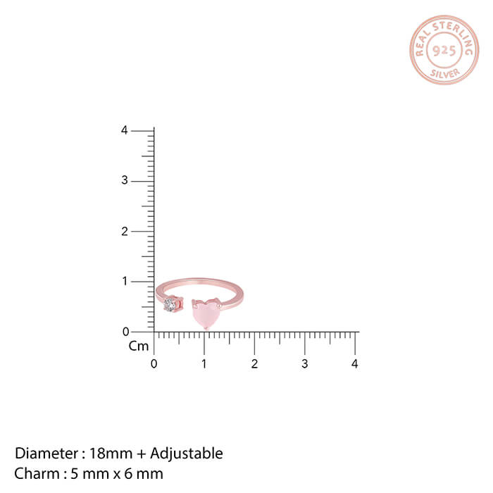 The rose gold ring has an open centre with a heart on one end and a zircon stone on the other.