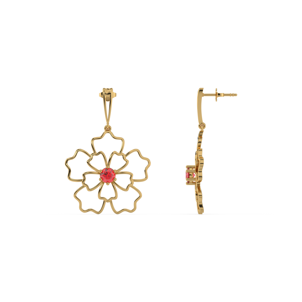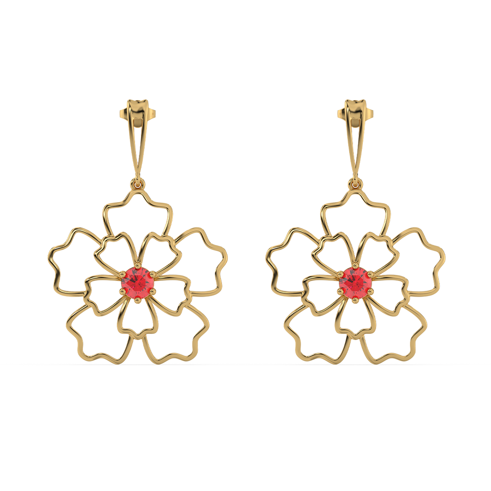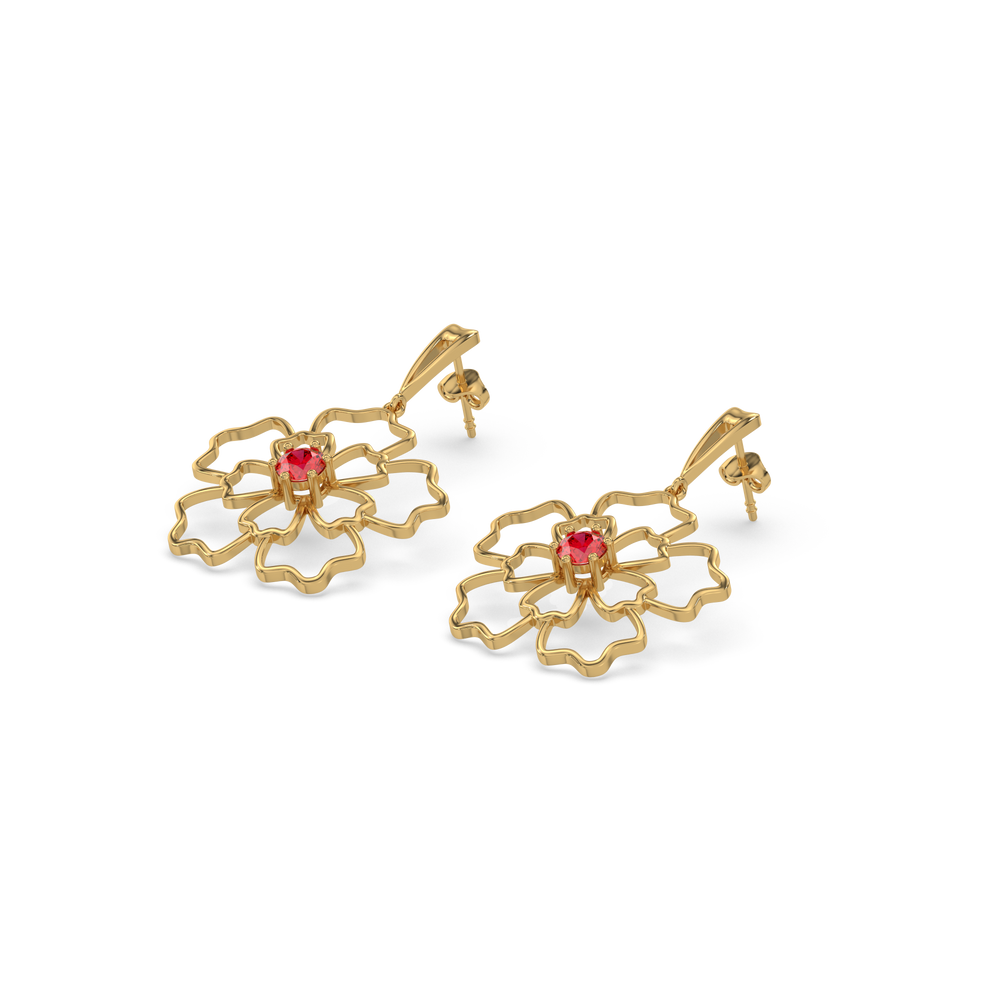 Embrace timeless charm with these exquisite Crimson Bloom drop earrings, featuring a delicate floral design brought to life with vibrant rubies at the center. Crafted in 18kt gold vermeil, they cascade gracefully with every movement, showcasing intricate petal detailing that captures the beauty of blooming flowers.