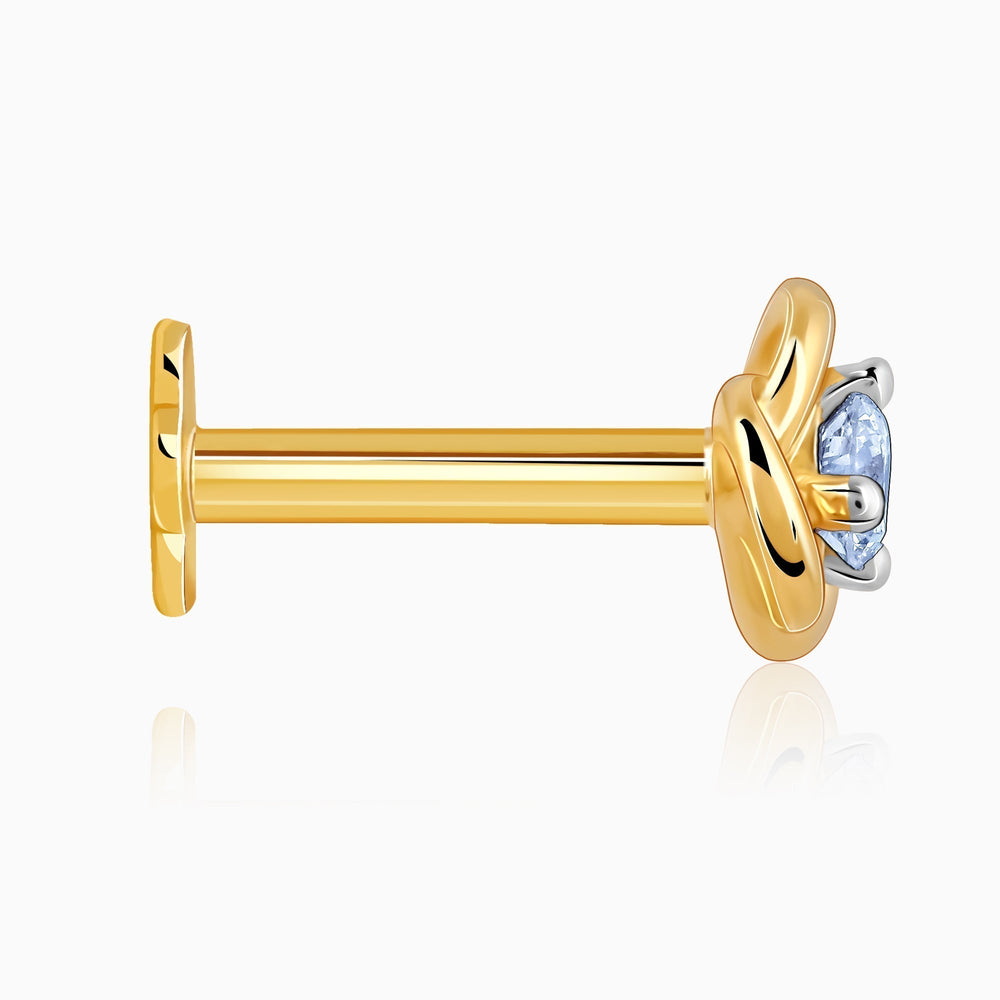 This pure gold nose pin for women features a floral motif studded with lab-grown diamonds.