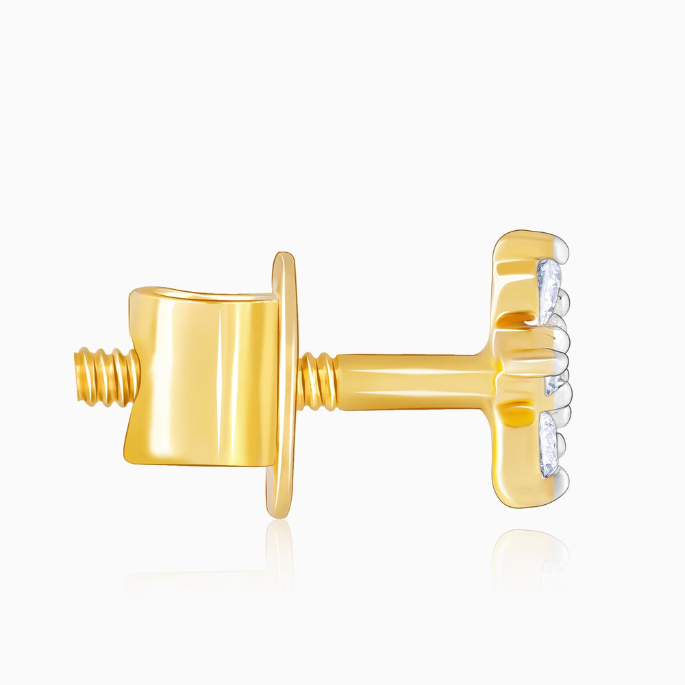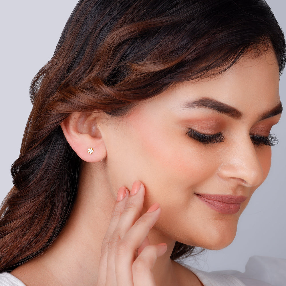 These gold earrings have a gorgeous five-petal flower-shaped design studded with lab-grown diamonds.