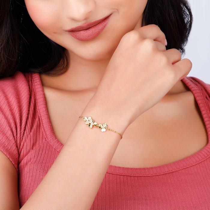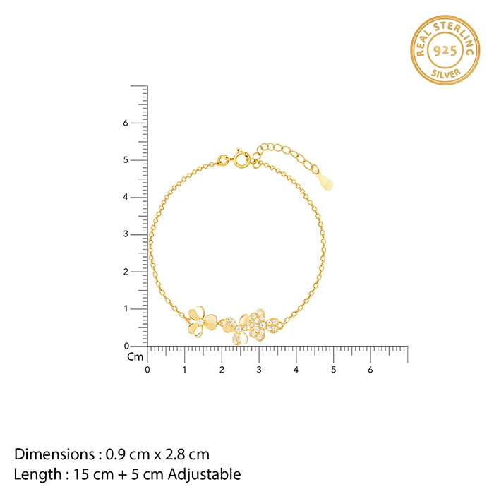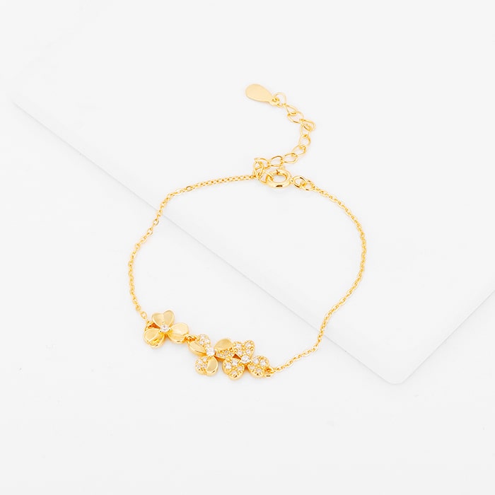 This golden bracelet features triple clover-shaped fowers with the pistil studded with zircons.