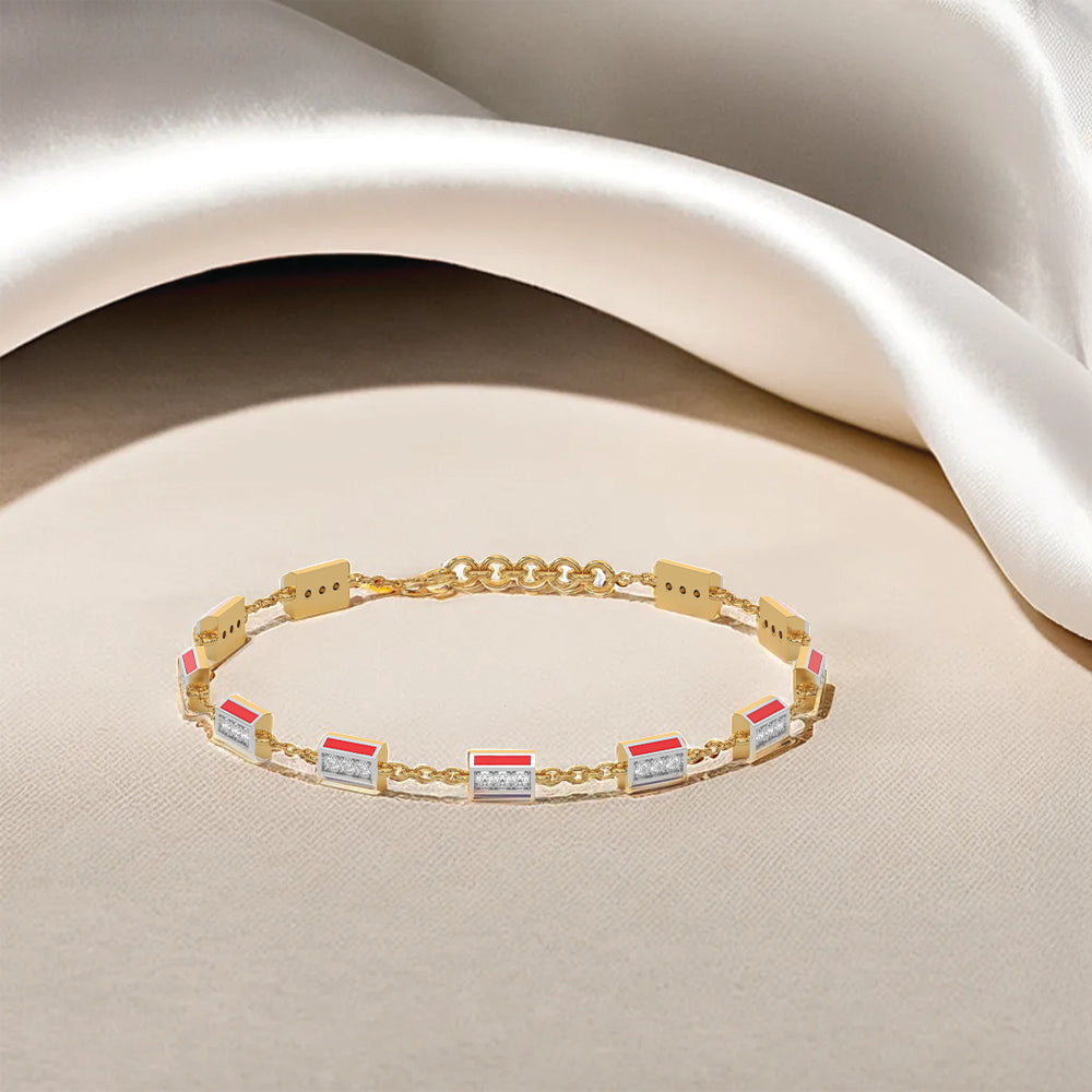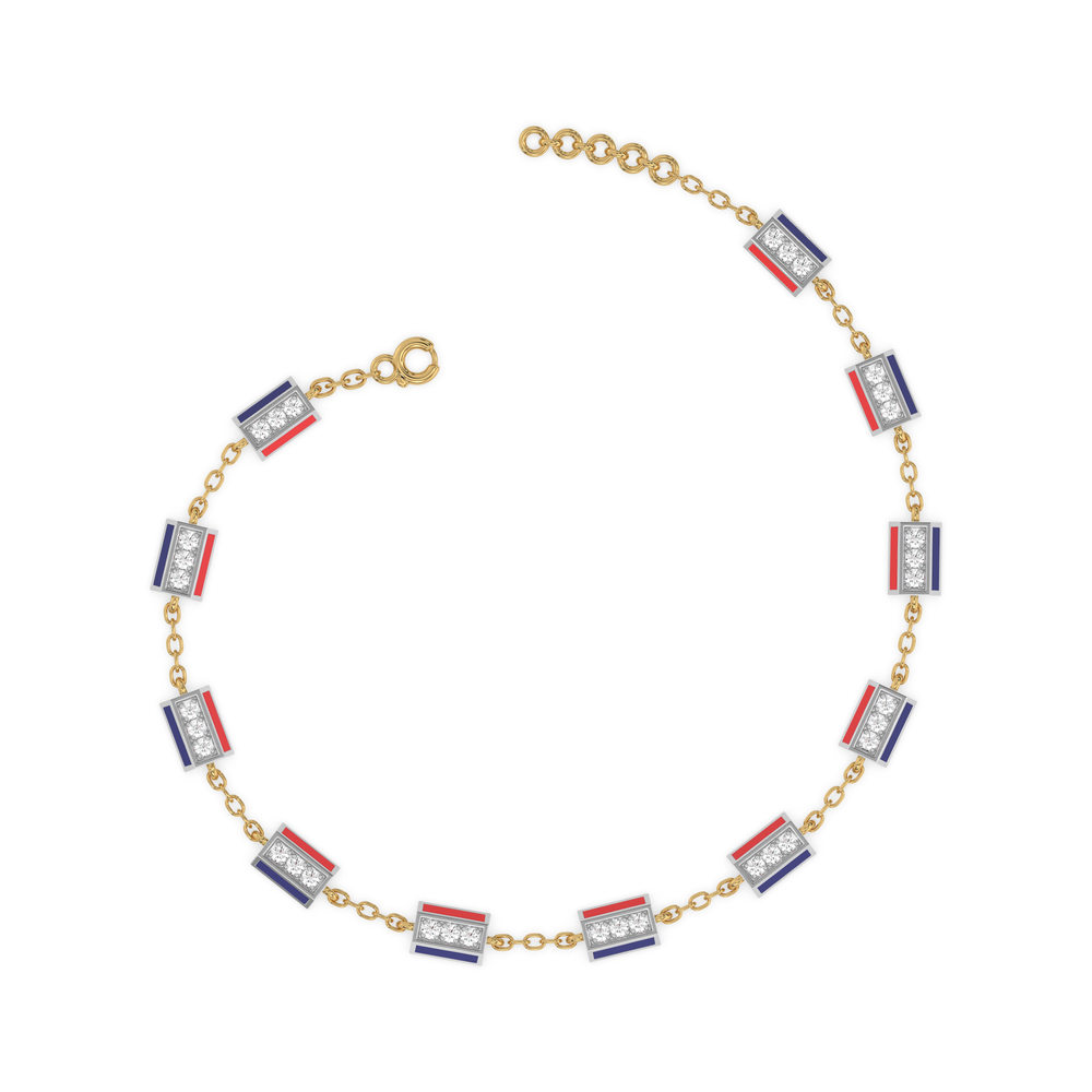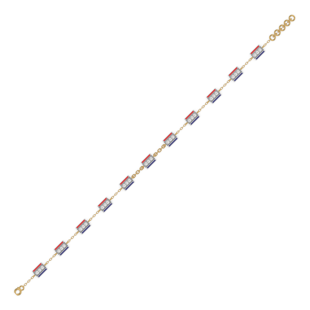 Add a playful burst of color to your wrist with the Chrome Bracelet. Featuring vibrant blue and red enamel accents, this station-style bracelet is a bold statement piece that celebrates individuality. Crafted in 18kt vermeil gold plating, it’s adorned with lab-grown diamonds, combining brilliance with ethical and sustainable design.