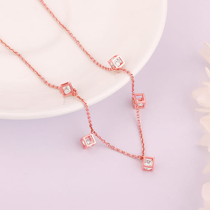 This rose gold necklace features interspaced cube motifs encasing zircons.