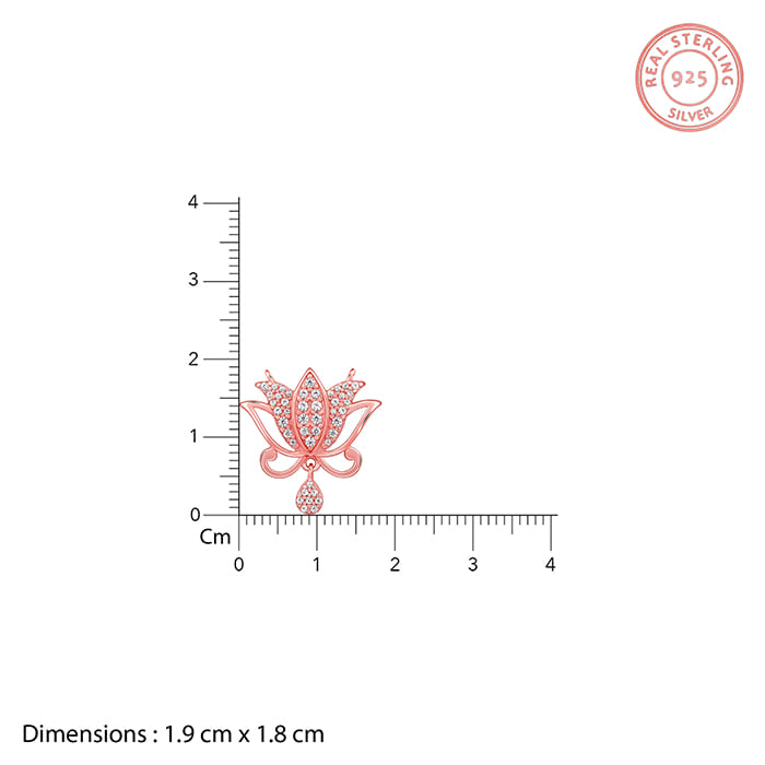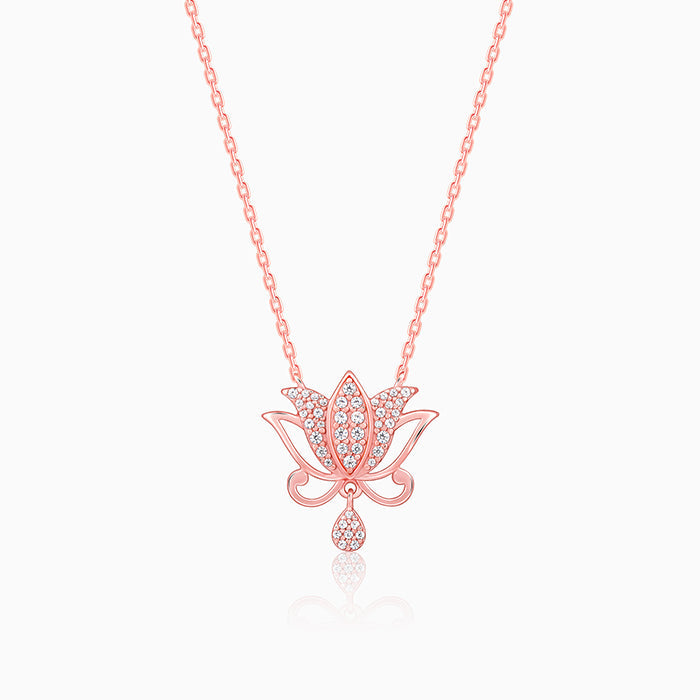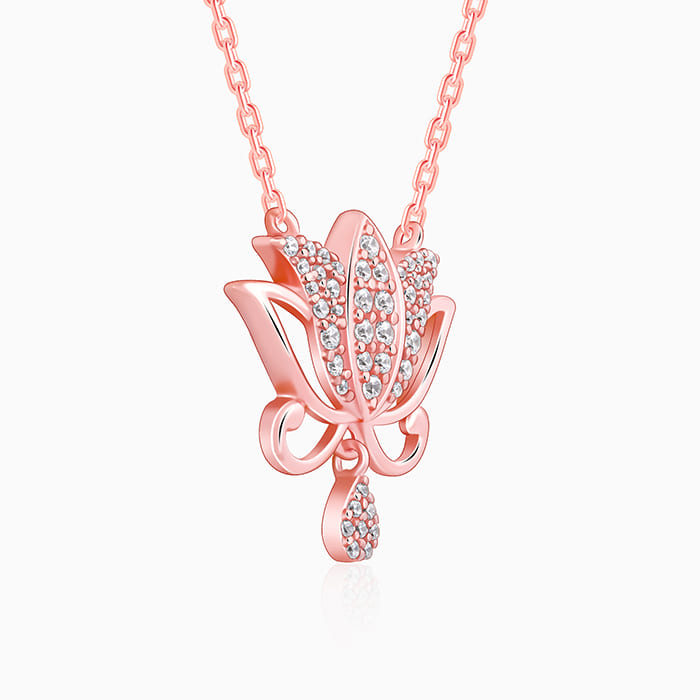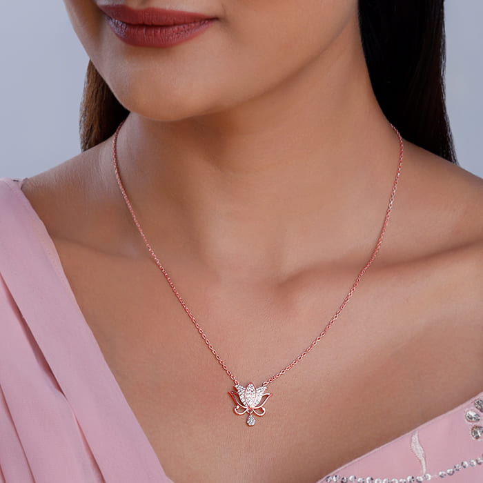 This rose gold necklace features a lotus motif, with shimmering zircons and a graceful drop zircon. Celebrate the timeless beauty of Indian textiles with GIVA's latest 'Magic of Tradition' collection. Wear and celebrate tradition, anytime.