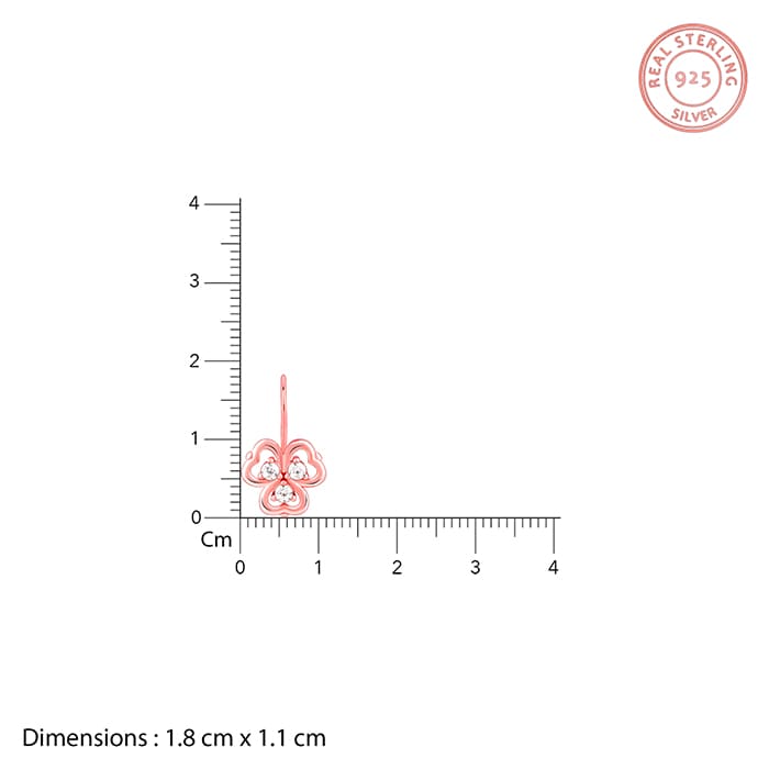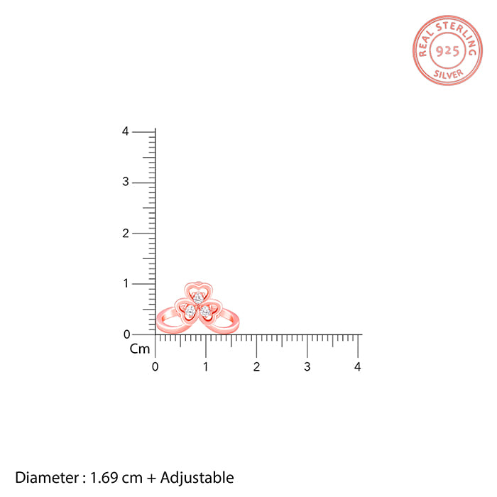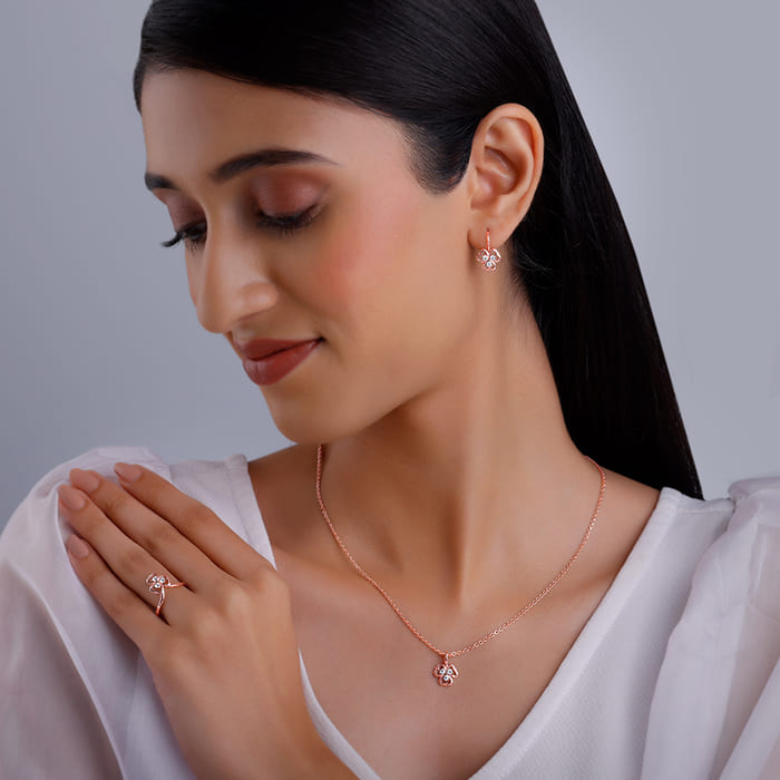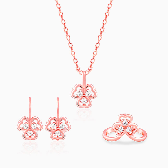 This rose gold set of three contains a pendant with a link chain, a pair of earrings, and a ring, featuring a three-clover leaf design with each leaf nestling a zircon.