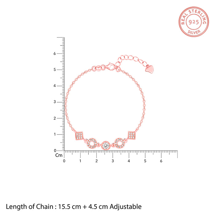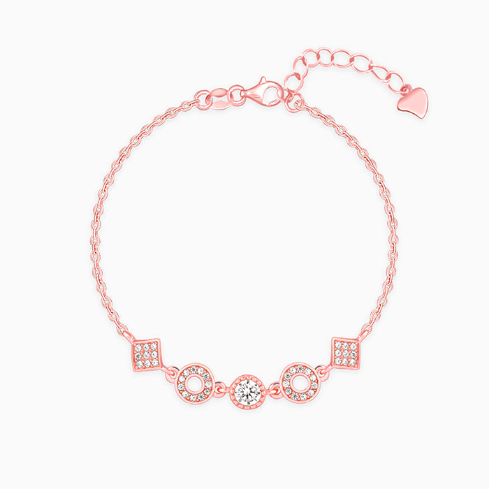 This rose gold bracelet features alternate circular and square-shaped motifs studded with zircons.