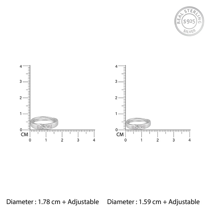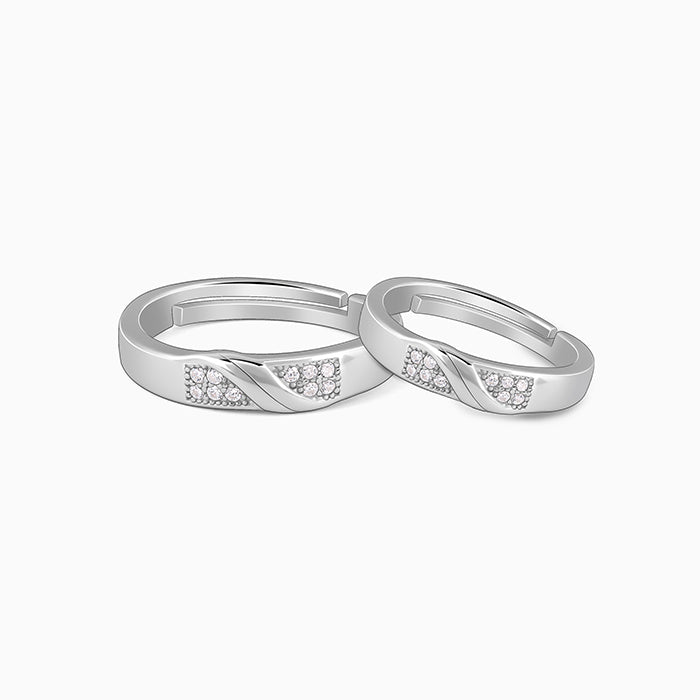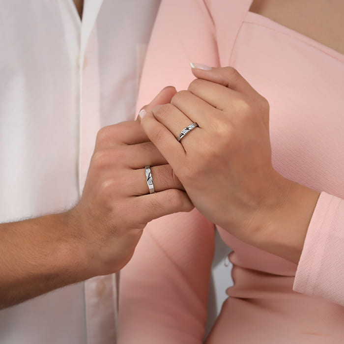 These silver couple bands feature a graceful twist detail at the centre, seamlessly studded with zircons.