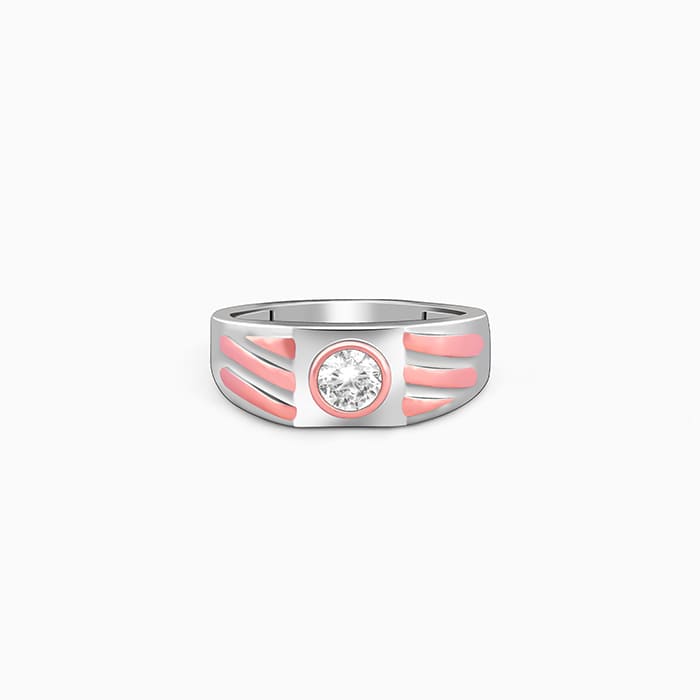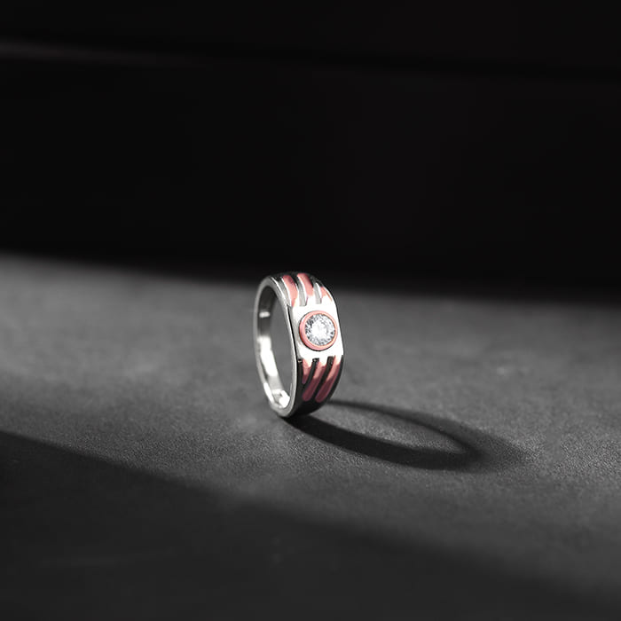 This silver ring has a square design, studded with zircons, with linear cut work along the band.