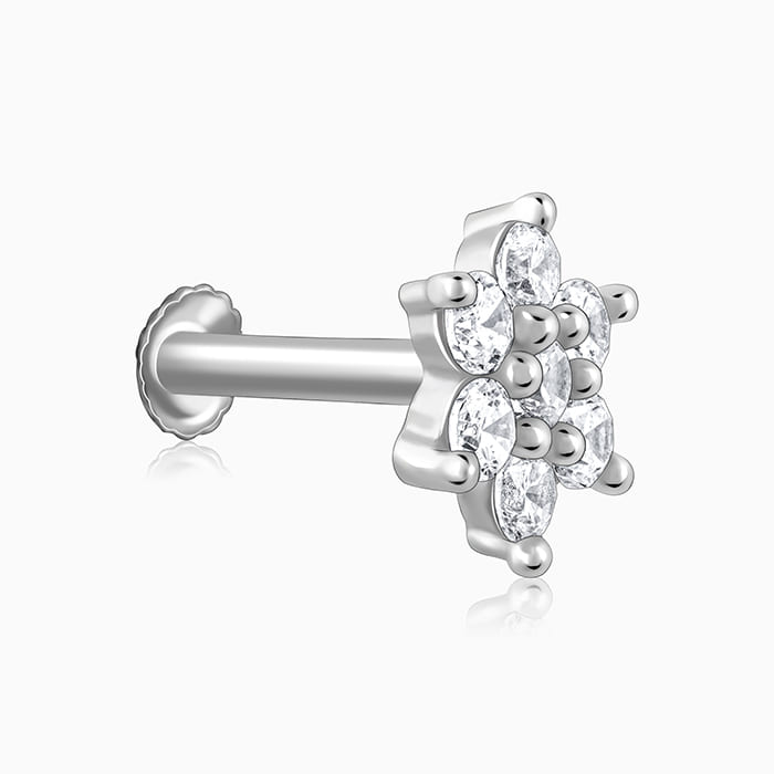Featuring a floral shape, this nose pin has petals studded with zircons.