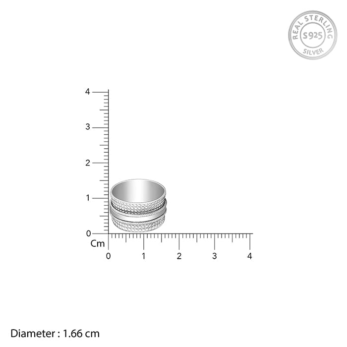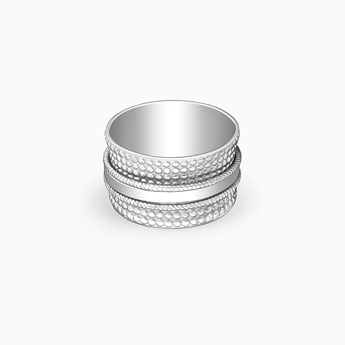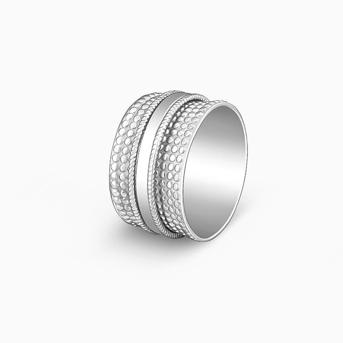 This silver ring has circular impressions over which there are three other rings with a spin mechanism.