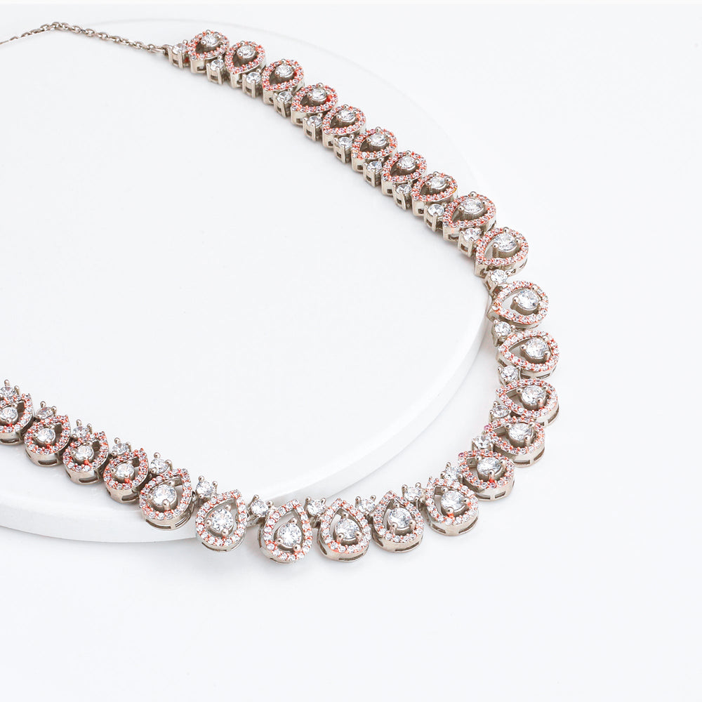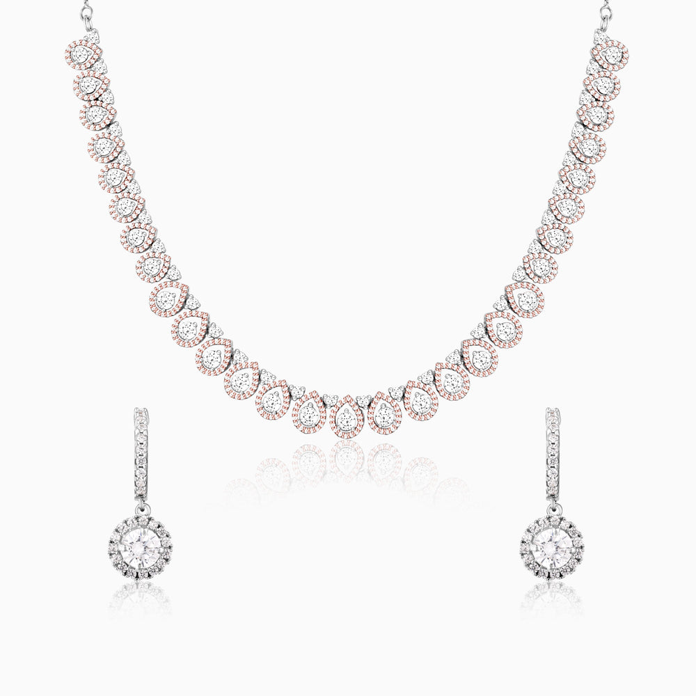 This rose gold set has an elegantly designed necklace and silver drop earrings studded with zircons.