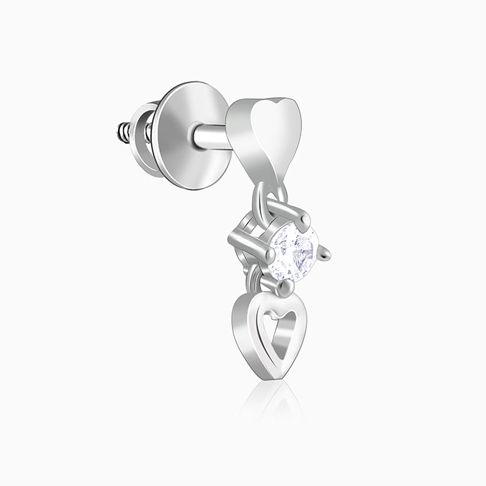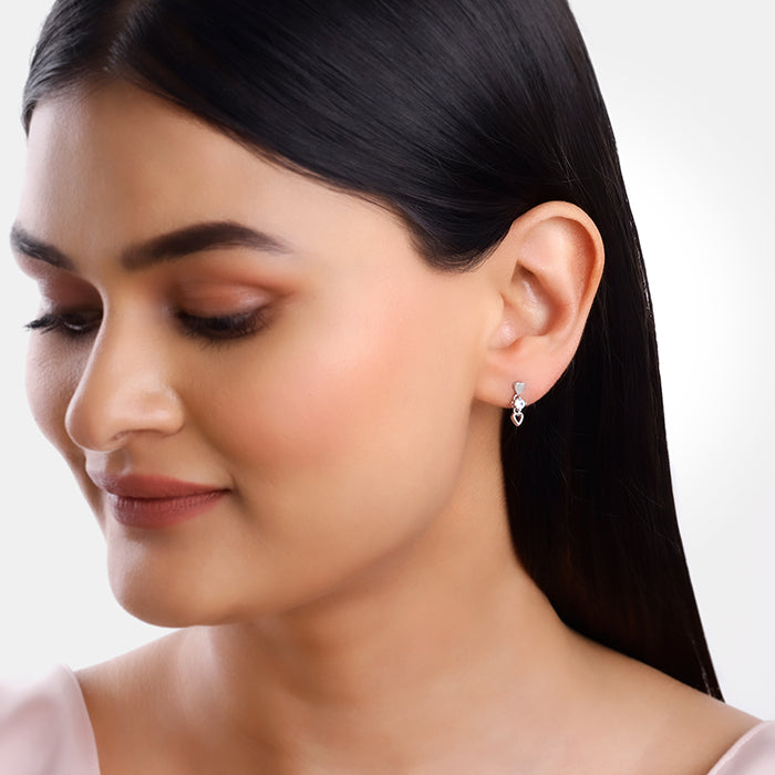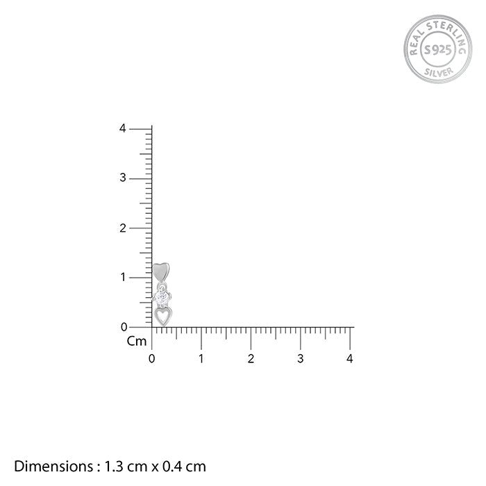 These silver earrings for women feature a heart motif with a sparkling zircon set just below it. Beneath the zircon hangs an elegant open heart design.