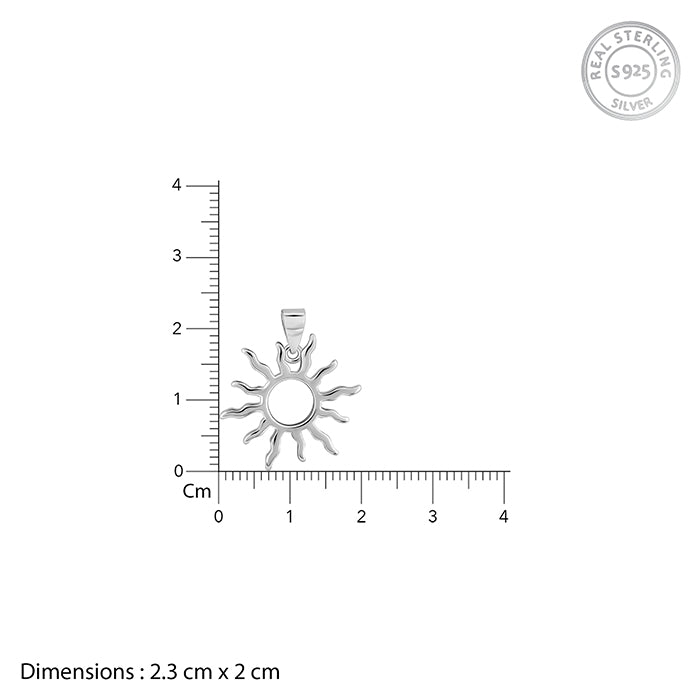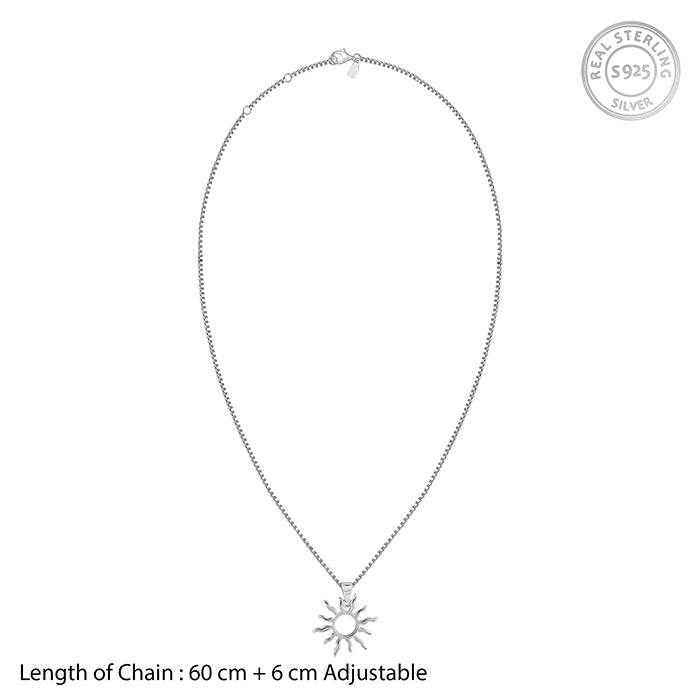 This silver pendant with a link chain features a sun motif.