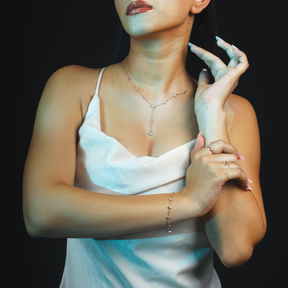 Inspired by the stars, the Celestial Stars Station Bracelet features a series of delicate star-shaped stations, gracefully connected by a slender chain. Crafted in 18kt vermeil rose gold plating and adorned with 0.23 ct of lab-grown diamonds, this bracelet is the perfect accessory to elevate your girls glam night, date night, or party look.