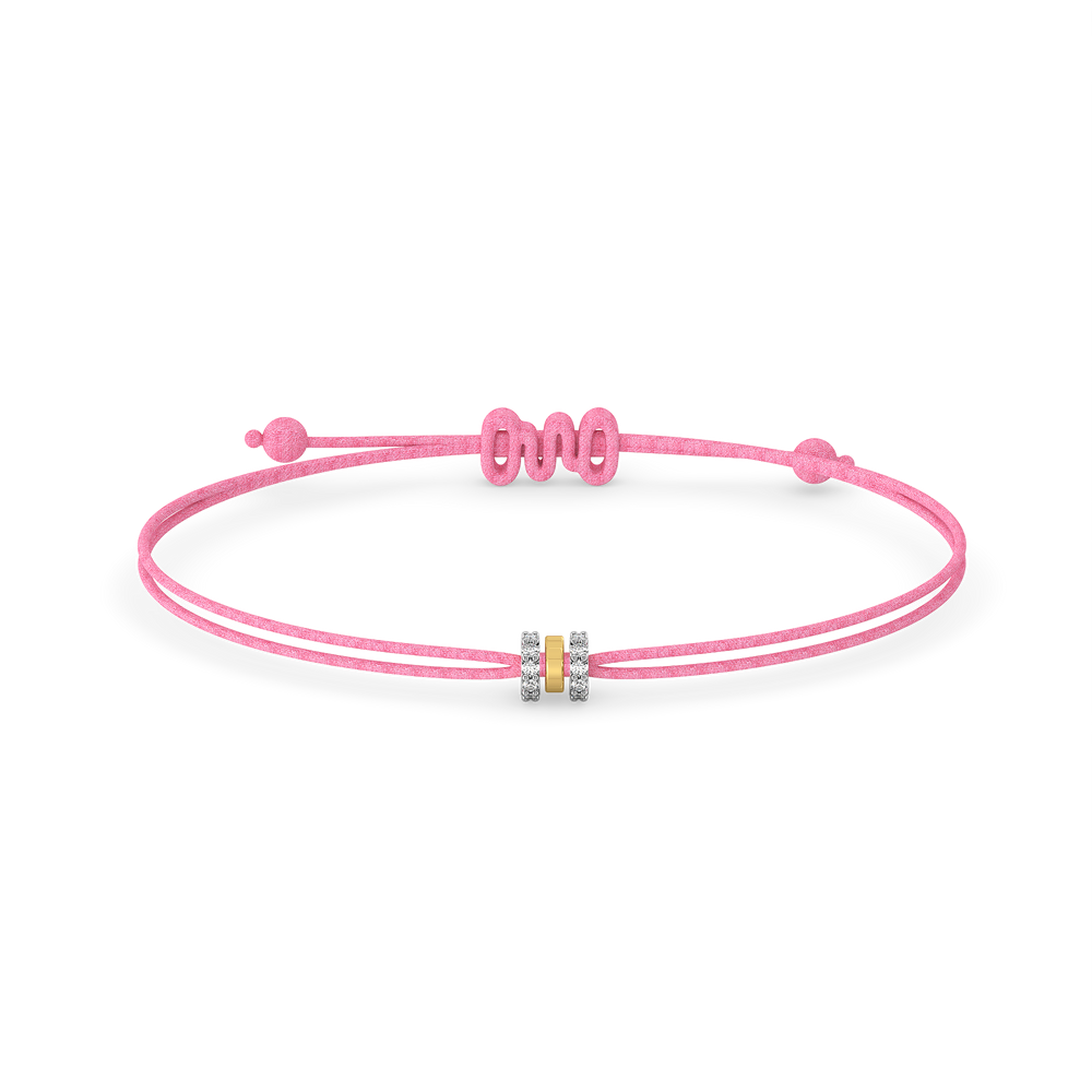 Three circles. Two colors. One unforgettable bond. This duo bracelet set, designed for Phoebe and her kindred spirit, features interlinked rings — one in 18kt Gold Vermeil and the other shimmering with lab-grown diamonds — on vibrant pink and blue cords. Inspired by friendship bracelets of the past, it’s a grown-up twist on childhood memories.